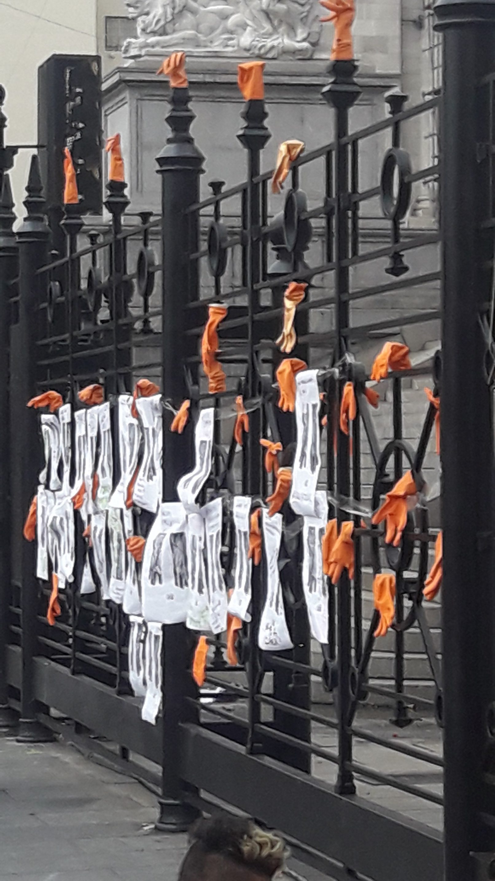 Viajaron hacia el Congreso de la Nación, con los guantes de cocina naranja, remeras y papeles estampados con esos mismos guantes. Y una vez allí se dio participación a los transeúntes, para escribir frases alusivas al día, sobre esos papeles.