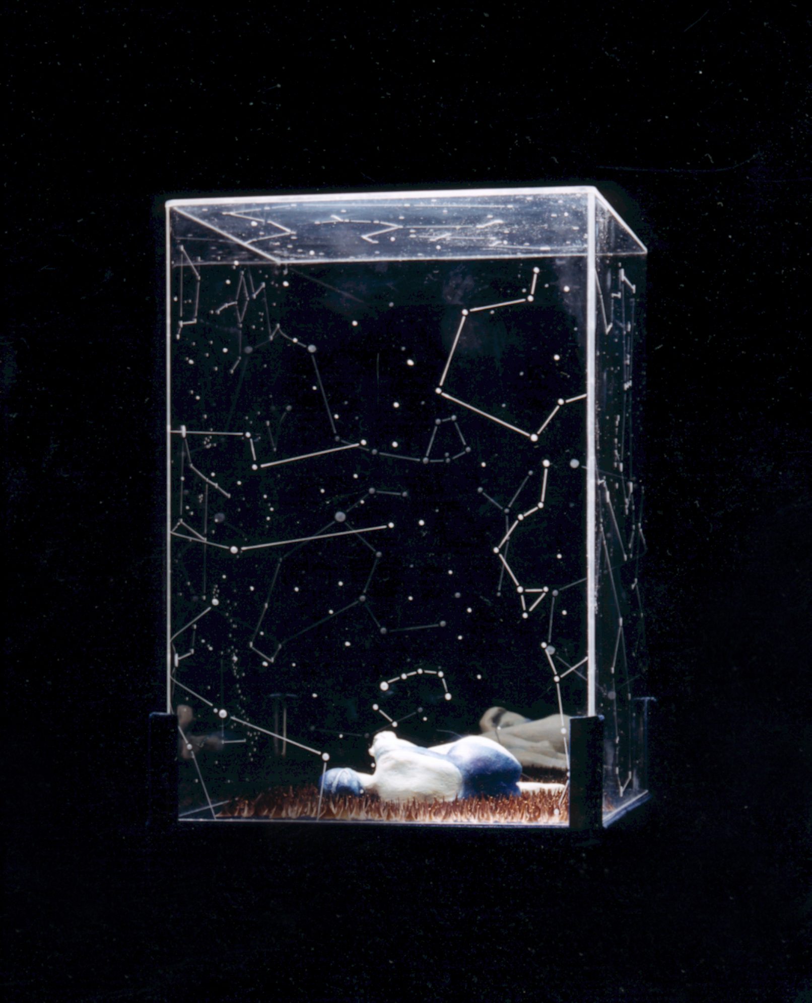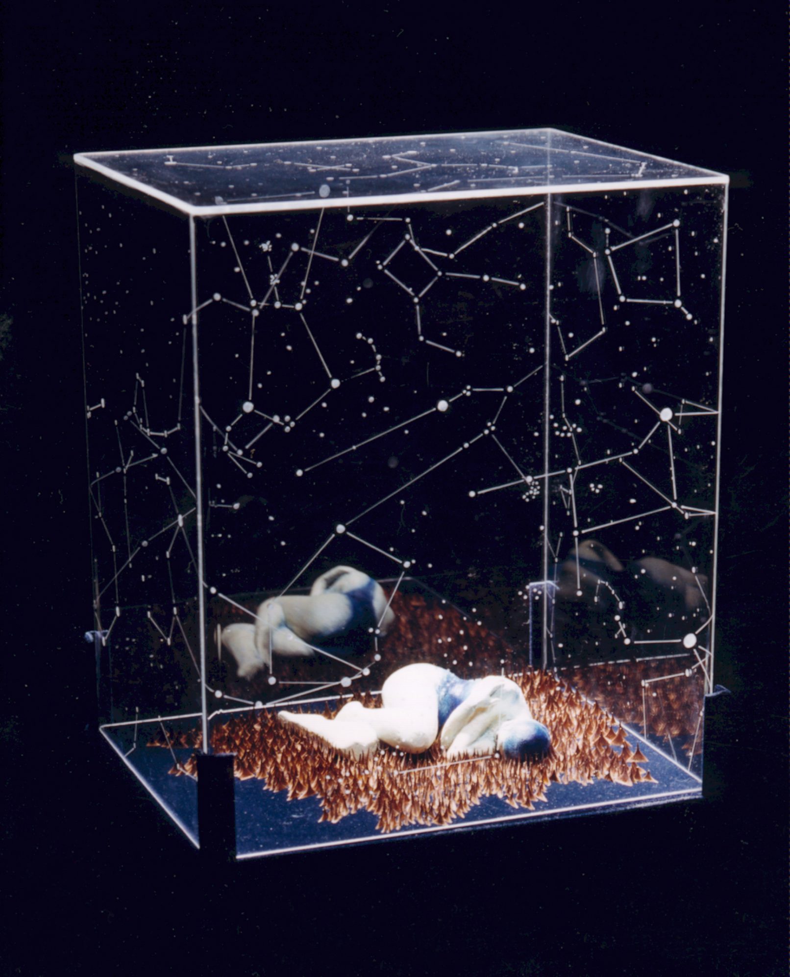 Tela pana azul / acrílico transparente grabado / espinas de rosas / cerámica patinada